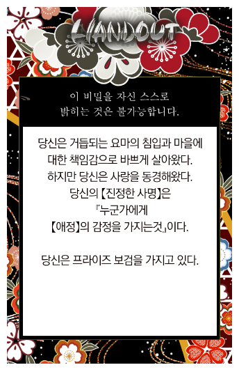 아니 근데 솔직히. 비밀 갖고는 딱히 무서워할 여지가 없긴 해요. 시나리오는 특수형이라 해도 특수형이니까 협력의 여지가 있다는 거고... 요마가 침입하는 마을이라 하니, 클라이맥스에 등장할 에너미가 요마일 수도 있는 거잖아요. 대립형의 위기가 있을 뿐 이 시나리오는 요마 때려잡기가 주가 되는 이야기를 담고 있고 PC들은 알콩달콩 잘 지내면 됩니다~ 일 수도 있는 거잖아요. 그래서 저는