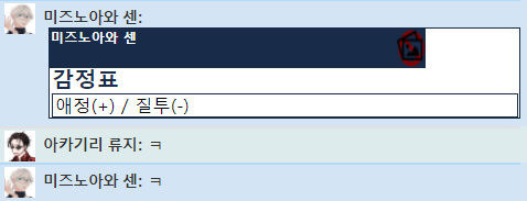 아니 저 진짜 너무너무 웃겼던 게, 저는 자캉님께서 감정 판정을 하신다길래, 헉흑헉 어 어떡하지? PC1 전용 배경 어떻게 하면 안 들킬 수 있을까? 애정은 갖고 싶은데 배경 들키고 싶지는 않아! GM님 어떡하면 좋죠?! 하고 후다닥 귓속말 드리고 있었거든요. 그런데 참 이게... 들킬 일도 없이 화려하게 애정/질투를 띄워버려가지곸 제 PC 미즈노아와 센의 진심과 실력에 웃음이 나왔어욬