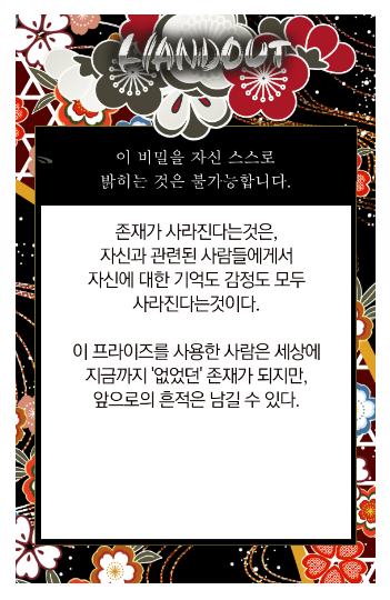 간략하게 PC 설정을 이야기하고, 특기 리스트와 습득 인법과 배경-장점을 공유하고서 프리 플레이를 종료했습니다. 실은 신념과 배경-약점도 공개...정보로 취급하긴 하지만? 하지만... 기깔나는 타이밍에 RP와 함께 공개하면 더 맛있으니까요. 사전 공개 정보는 여기까지.